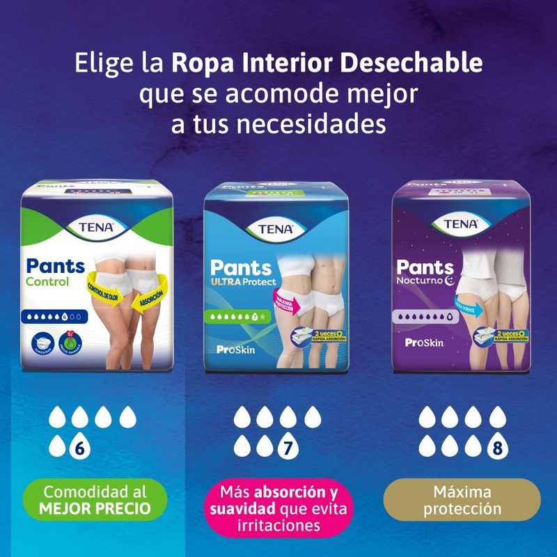• Ropa interior absorbente con tecnología TENASORB que gelatiniza los líquidos y ayuda a neutralizar el olor a orina.